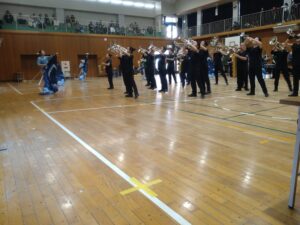 当日午前中は、歴史ある吹奏楽強豪校、池田市立呉服(くれは)小学校の体育館をお借りして練習を行いました。ウェルカム演奏では、小学生とは思えない全国レベルの演奏に大いに刺激を受けました。本校もお礼としてプチコンサートを披露し、大会の最終調整・練習を見学してくれた小学生たちと一緒に昼食を取って交流を深めました。出発時には、全員でお見送りをしていただきました。