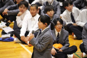 4月10日(金)、全校生徒が体育館に集合し、2・3年生による新入生歓迎セレモニーが開催されました。新入生の入場時には在校生から温かな拍手が起こり、華やかに幕を開けました。 はじめに、和太鼓部・吹奏楽部・合唱部・ダンス部による歓迎パフォーマンスが披露されました。その後、生徒会による学校行事の紹介や部活動紹介が行われました。今後は、部活動説明会や体験会も予定されています。多くの1年生が部活動に所属し、それぞれの場で活躍してくれることを期待しています。 最後に、生徒会長と1年生代表が握手を交わし、セレモニーは和やかな雰囲気の中で終了しました。