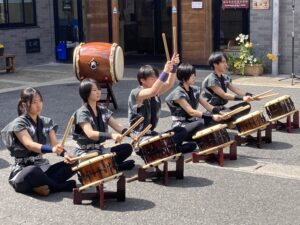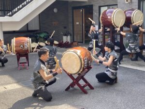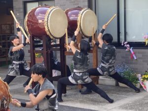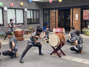 4月5日(日)倉敷市山地の(社福)和福祉会 特別養護老人ホーム庄の里で和太鼓部が演奏しました。桜の花びらが舞う晴天の中、お花見会の出し物として3曲披露させていただきました。生徒たちの生き生きとした演奏と、それを観てくださっている方々の晴れやかな表情が印象的でした。これからも様々な場所で演奏しますので、応援よろしくお願いします。